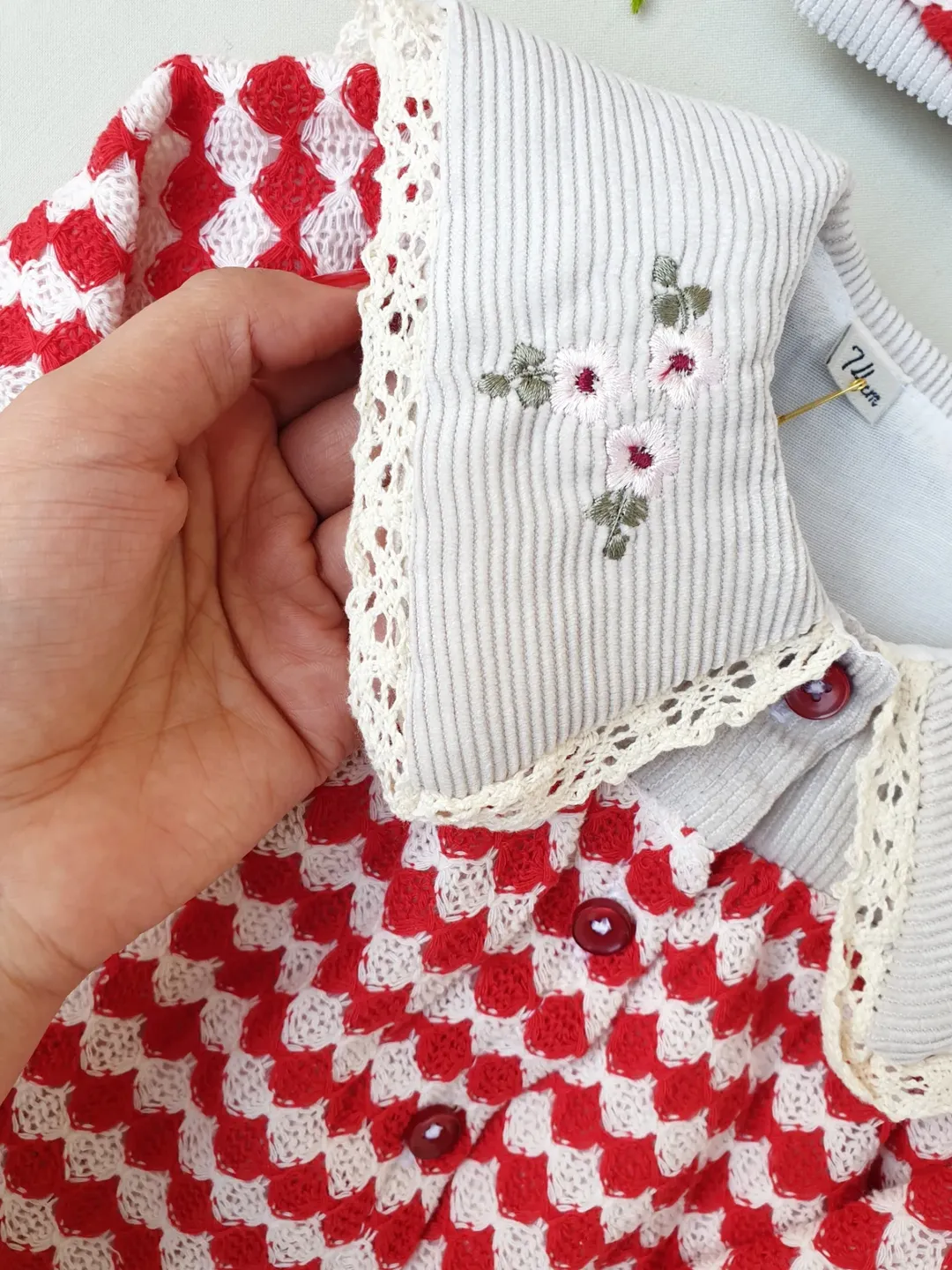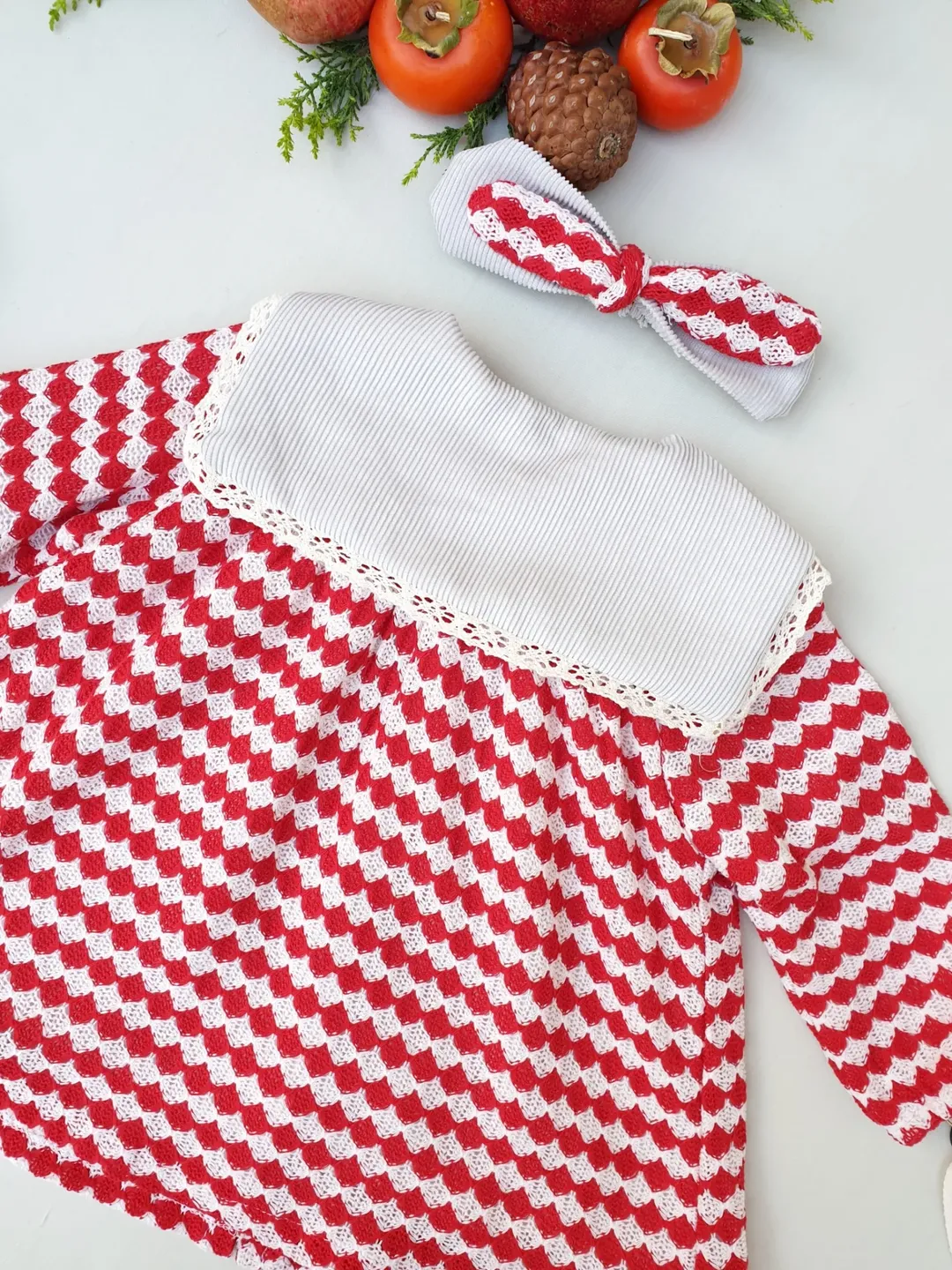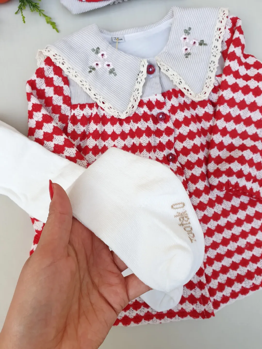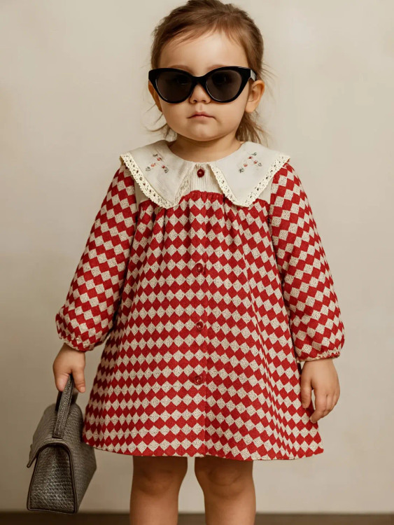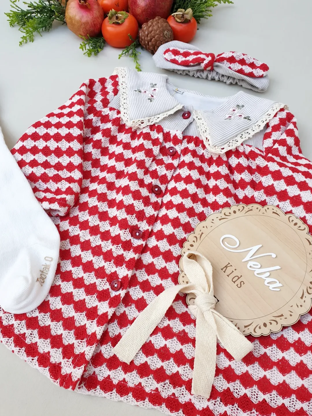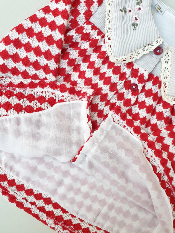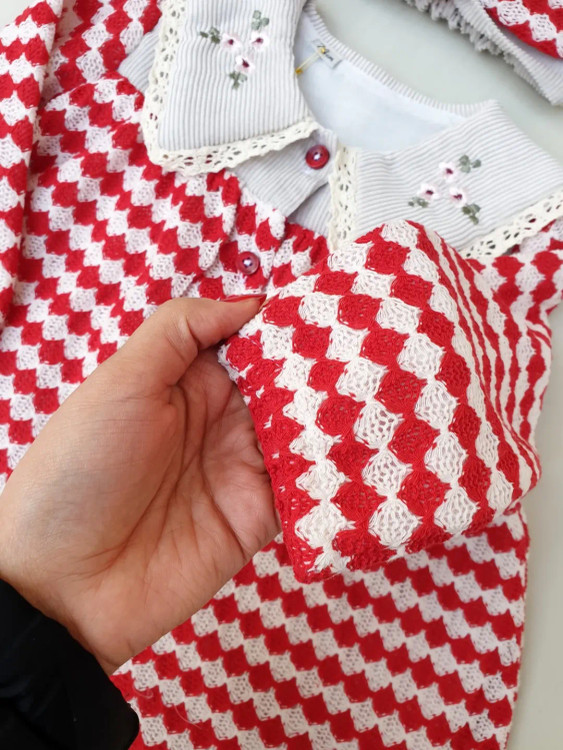 پیراهن یلدایی با یقه گلدوزی شده، از پارچه بافت ترک و دارای آستر. این پیراهن مناسب برای سنین ۹ ماه تا ۳.۵ الی ۴ سال است و به همراه تل عرضه میشود. این پیراهن برای یلدا و همچنین عید مناسب است.
